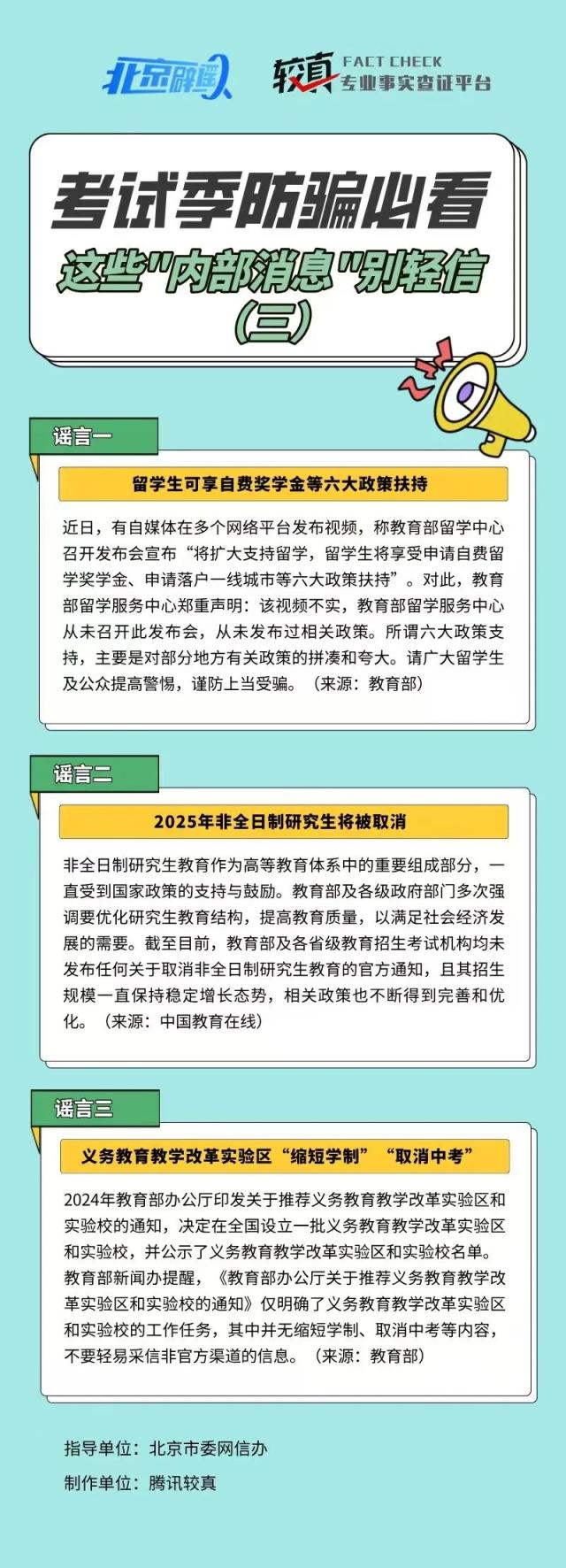 正值考试招生宣传热季,网上涉及考试招生政策的信息层出不穷,一些不法分子,打着所谓“内部消息”等幌子,迷惑欺骗考生和家长。小编郑重提醒广大考生和家长,请从教育部门、招考机构和学校官方渠道获取权威信息,不要轻信未经核实的政策内容。
